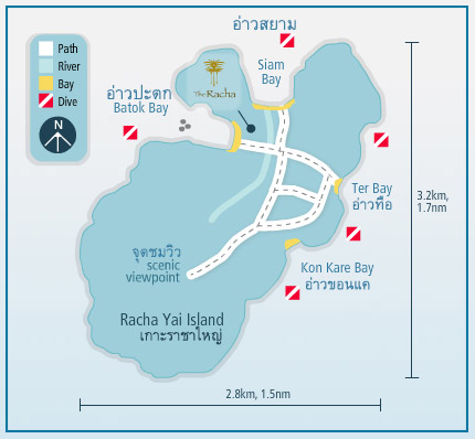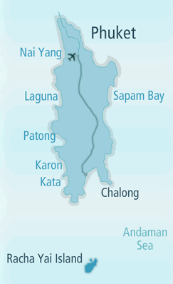 | Set on Batok Beach overlooking one of Thailand's most spectacular bays on Racha Yai Island, 12 miles to the south of Phuket. 45 minutes transfer from Phuket International Airport to Chalong Bay followed by an additional 30 to 45 minutes by sea. Batok Bay and the beach in front of the resort are public areas and are used by other boats and tourists during the winter months from November to April. | |